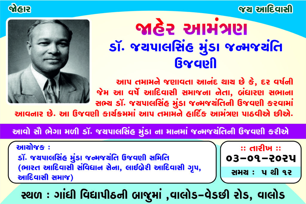 :: જાહેર આમંત્રણ :: વાલોડ ખાતે 3 જાન્યુઆરી 2025 ના રોજ ડૉ. જયપાલસિંહ મુંડા જન્મજયંતિ ઉજવણી થશે